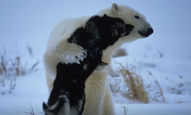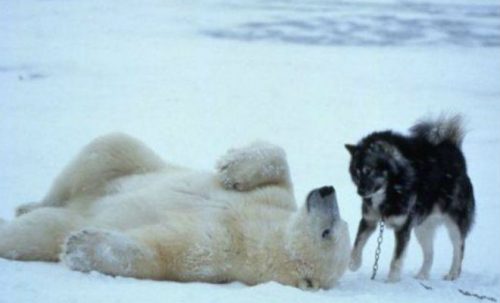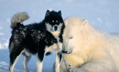 Фотограф по имени Брайан Ладун обследовал территорию на крайнем севере, где обитают белые медведи. Внезапно он заметил, что его собака, хаски, на мгновение исчезла из поля зрения. В следующую секунду он увидел, как к собаке вплотную подходит огромный белый медведь и кладёт ей лапу на голову. Брайан был слишком далеко, чтобы что-то предпринять, и мог только наблюдать.