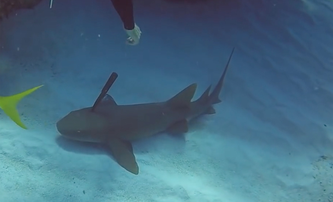 Оставив туристов, Бретт Джонсон приблизился к акуле, заметив что-то вроде палки, выступающей из ее головы.