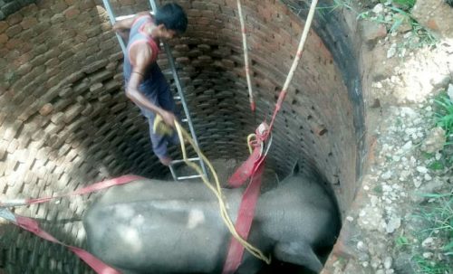 Юный слон упал в глубокое углубление недалеко от армейского лагеря в Джалпайгури, Западная Бенгалия. Стражи лагеря первыми заметили необычные шумы.
