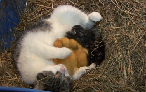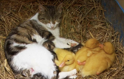 Вскоре у Даллы появились котенки, и одновременно с этим событием на ферме родились утята. Однако у утят не было матери. Из своего уютного уголка Далла заметила птенцов, и что-то в их писке задело за живое в ее материнской душе. Она тут же принялась заботиться о птенцах, перетащив их к себе и обогревая своим телом.