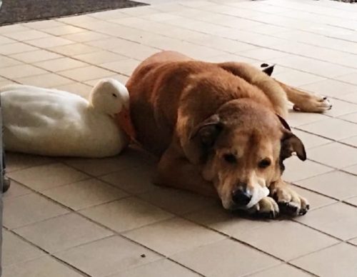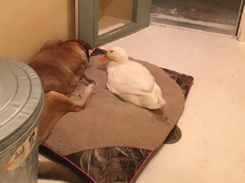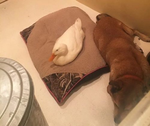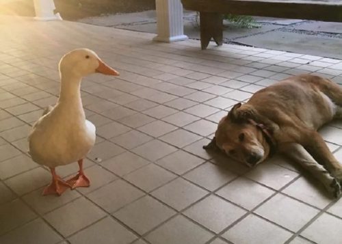 Эта грустная рутина продолжалась два года, пока однажды весной не произошло нечто невероятное. Дикая утка, которую позже назвали Дональдом, внезапно вошла в их дом и приблизилась к Джорджу. После нескольких моментов невидимого «диалога», утка прижалась к собаке, а Джордж положил голову на птицу. Джеки была потрясена этим событием.
