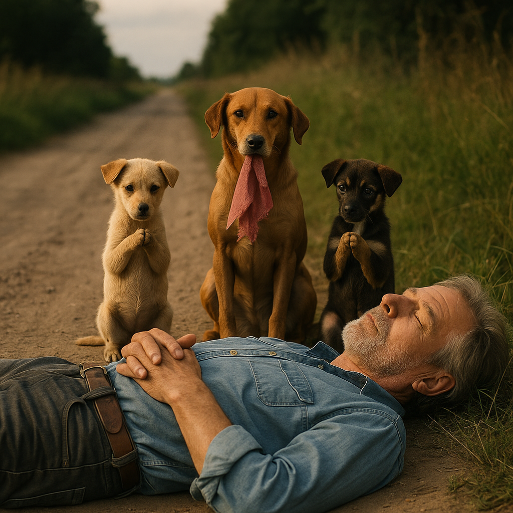 На обочине пыльной дороги стояли три собаки — но не так, как их привыкли видеть. Они выпрямились на задних лапах, словно люди, а передние держали вместе, будто в молитве. У матери в пасти болтался окровавленный кусок ткани, дрожащий от ветра. Два крошечных щенка, трепеща, прижимались рядом и не сводили с неё глаз. Над дорогой стояла предвечерняя тишина — та самая, когда слышен даже писк полевой мыши в траве.