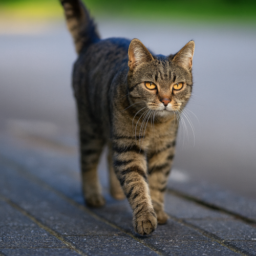 Кот шагал по обочине, не сбавляя хода. Мимо проносились машины, окатывая его горячим воздухом и дорожной пылью, но он словно не замечал ни шума, ни жара — продолжал идти вперёд.