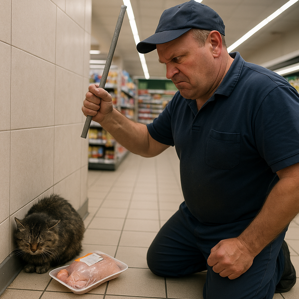 Понимая, что у него нет иного выхода, кот решился на отчаянный шаг — отправиться к супермаркету с яркой вывеской «Перекрёсток». Он знал: там полно еды, но не для таких, как он. Во дворе можно было наткнуться на стаю бездомных собак или попасть под зубы таким же голодным сородичам, и всё же он тащился туда из последних сил.