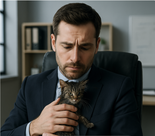 Через несколько минут в коридоре фирмы стояла тишина. По паркету капала вода — промокший насквозь начальник держал на руках котёнка. Вокруг собрались сотрудники.