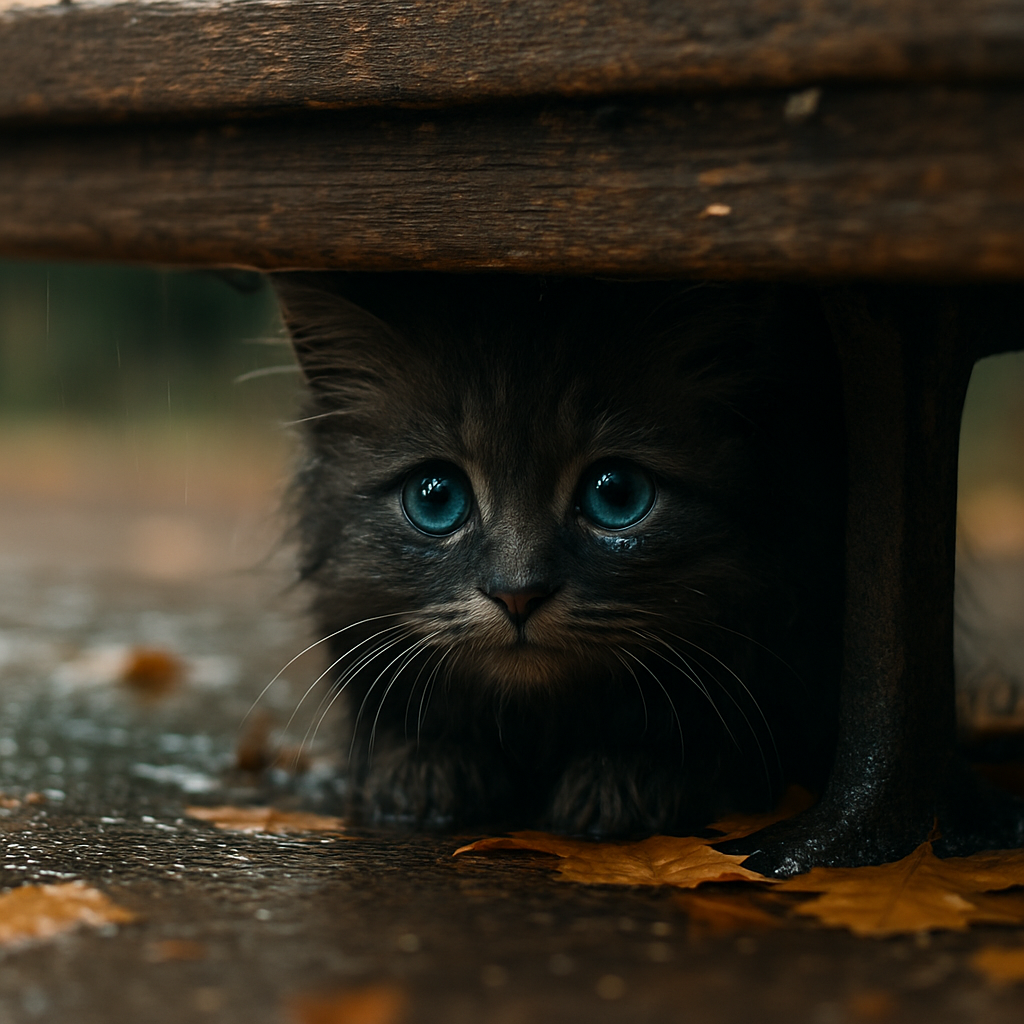 – Мяу… – котёнок дрожал так сильно, будто состоял из одних вибраций. Он тихо поскуливал, весь мокрый, продрогший и, судя по виду, очень голодный. Но хуже всего было то, что рядом с ним не видно ни кошки-мамы, ни людей, которые бы о нём заботились. Он сидел под скамейкой совсем один.