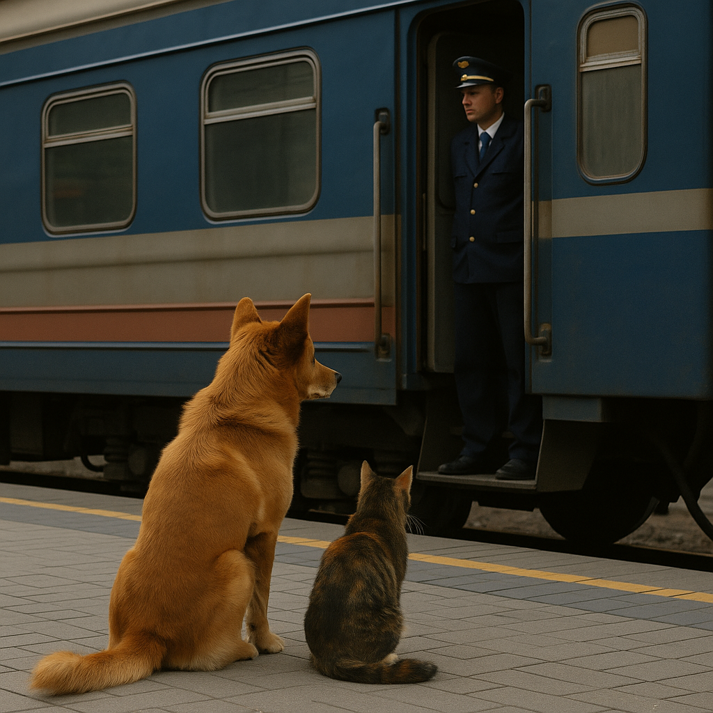 Когда вечерний состав подошёл к перрону, начальник поезда уже стоял в тамбуре, готовый сойти. Он вез подарки, как обычно, предвкушая пару дней отдыха у старого товарища. Но на перроне было тихо. И вдруг он увидел их — кота и собаку, сидящих у рельсов. Собака держала в зубах знакомую фуражку. По её морде катились слёзы. Кот стоял рядом, неподвижный, словно часовой.
