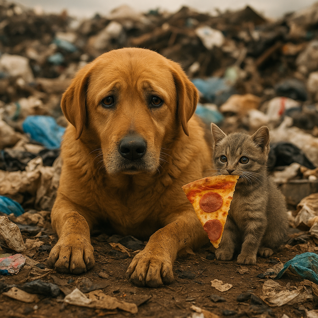 Он забрался на свалку, исчез среди пакетов и коробок, а через пару минут снова вынырнул — с огромным куском пиццы в зубах. Он уронил добычу прямо к лапам своей новой мамы, потерся мордочкой о её шею и довольно пискнул.