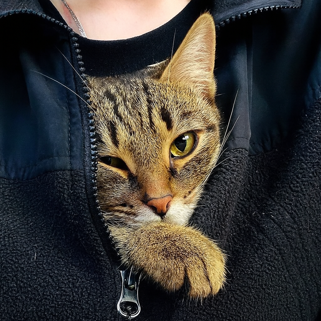 Из слегка приоткрытой куртки время от времени показывалась серенькая котовья лапка.