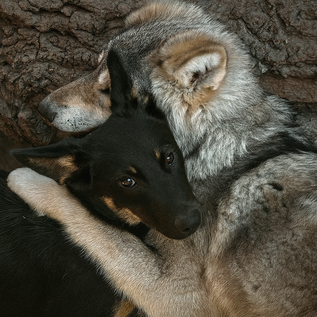 Когда дед вышел покурить, двери сарая были распахнуты. Внутри, в полутьме, он увидел волка. Тот осторожно обнимал Найду лапой и тихо покусывал её за шею — нежно, по-своему.