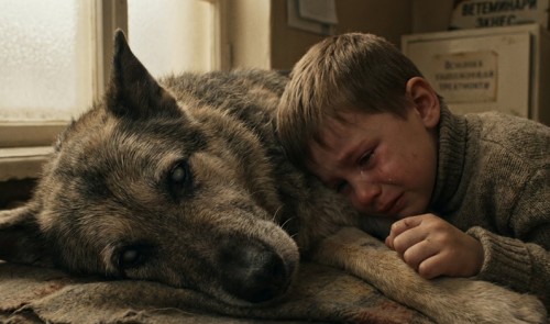 Рекс с трудом вытянул морду и лизнул Сашину руку — медленно, влажно, будто оставлял последний знак: «я рядом… я с тобой». Хвост ещё раз слабенько дрогнул.