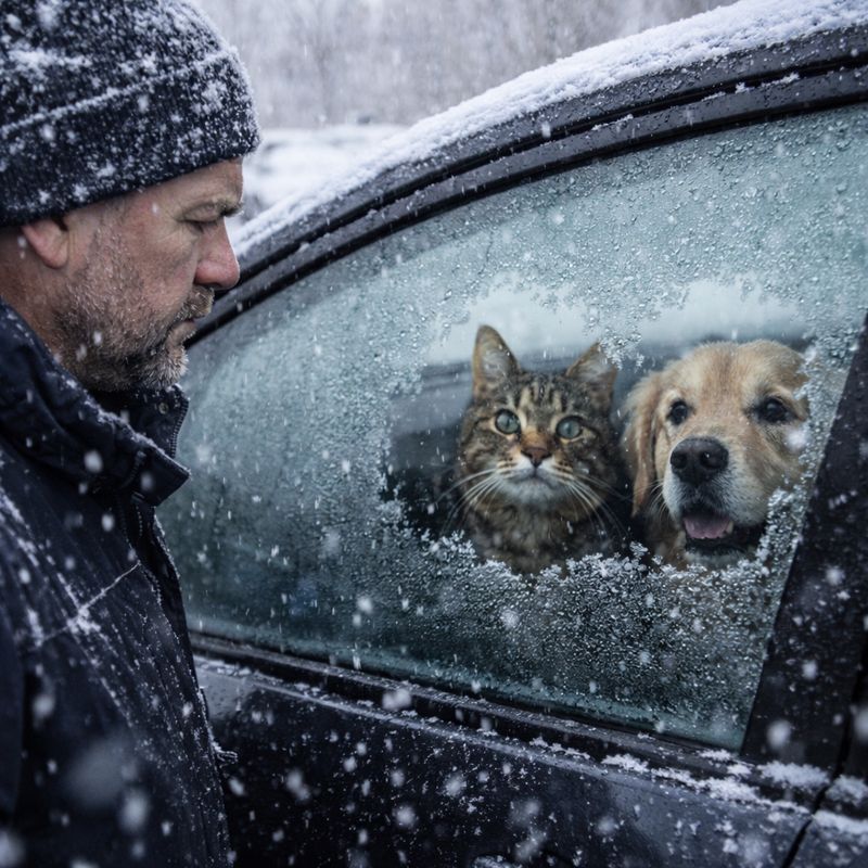 В небольшом участке стекла, оттаявшем изнутри от тёплого дыхания, он увидел две мордочки — собаки и кошки. Оба смотрели печально и настороженно. Обойдя машину, он дёрнул ручки дверей — закрыто. «Странно, — подумал он, — кто мог оставить животных в машине в такой мороз?» Решив, что хозяева, вероятно, зашли к кому-то в гости и скоро вернутся, он направился дальше.