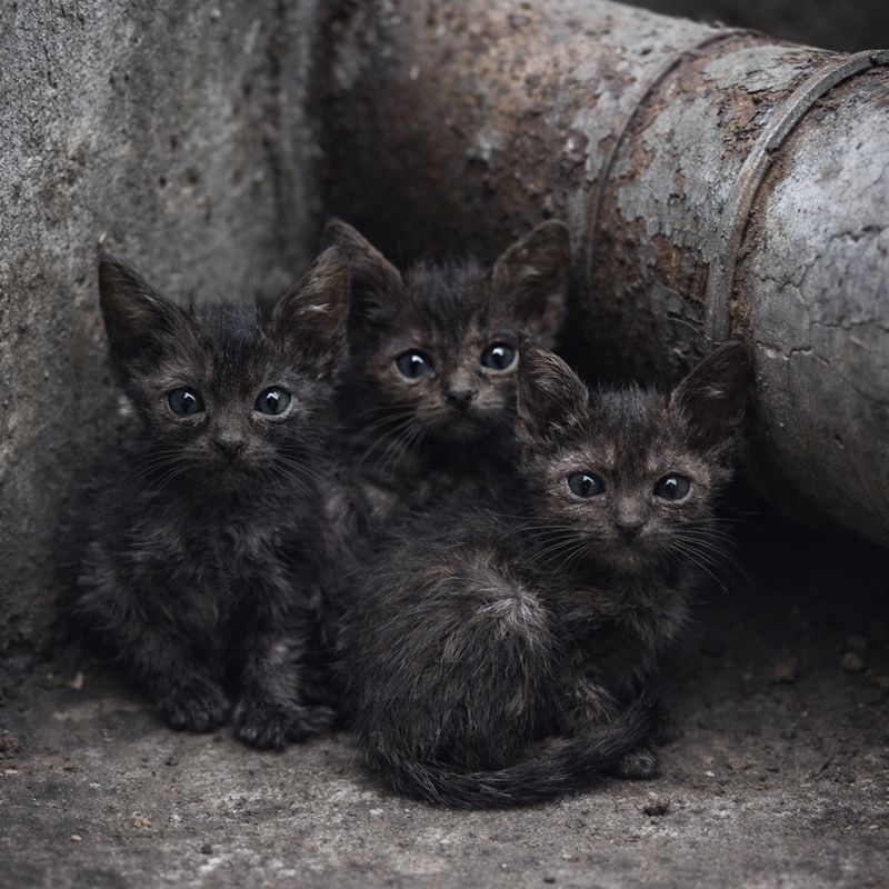 Подойдя ближе, он увидел троих котят. Они жались друг к другу, дрожали и испуганно смотрели на незнакомца. Совсем крошки — недели три от роду. Два мальчика и девочка, худенькие до прозрачности: одни глаза да уши.
