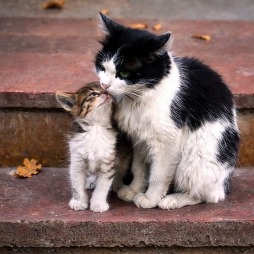 Вернувшись на место, он снова подтолкнул котёнка, заставив умыться, показывая, как надо. Лишь после этого улёгся, прижав малыша к себе.