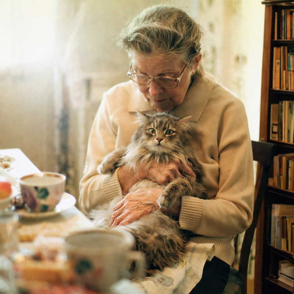 Он всегда приносил гостинцы из сезонного магазина, где можно было делать заказы. Во время задушевных бесед кошка неизменно сидела на коленях хозяйки.