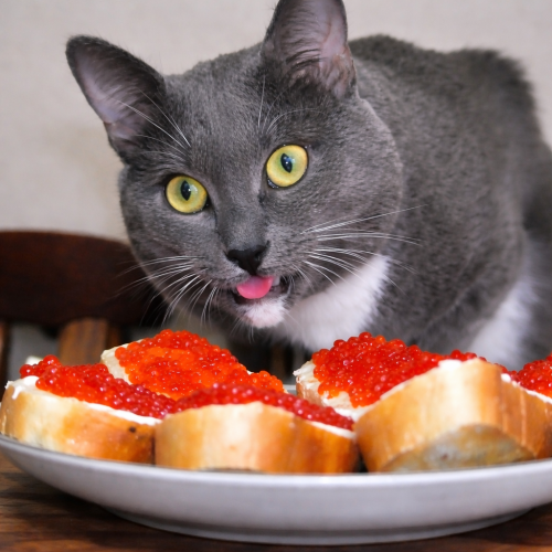 Похоже, кот прятался там, но запах мяса выманил его наружу. Максим протянул кусочек курицы — и хвостатый гость тут же вылез, устроившись прямо напротив. А на белой грудке у него, среди шерсти, заметно поблёскивали крупные тёмно-красные икринки.