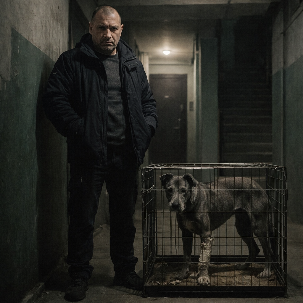 На лестничной площадке стоял мужчина грозного вида в дождевике, промокший до нитки. Рядом с ним находилась клетка, в которой сидел худой серый пёс с повреждённой лапой. Дмитрий нахмурился.
