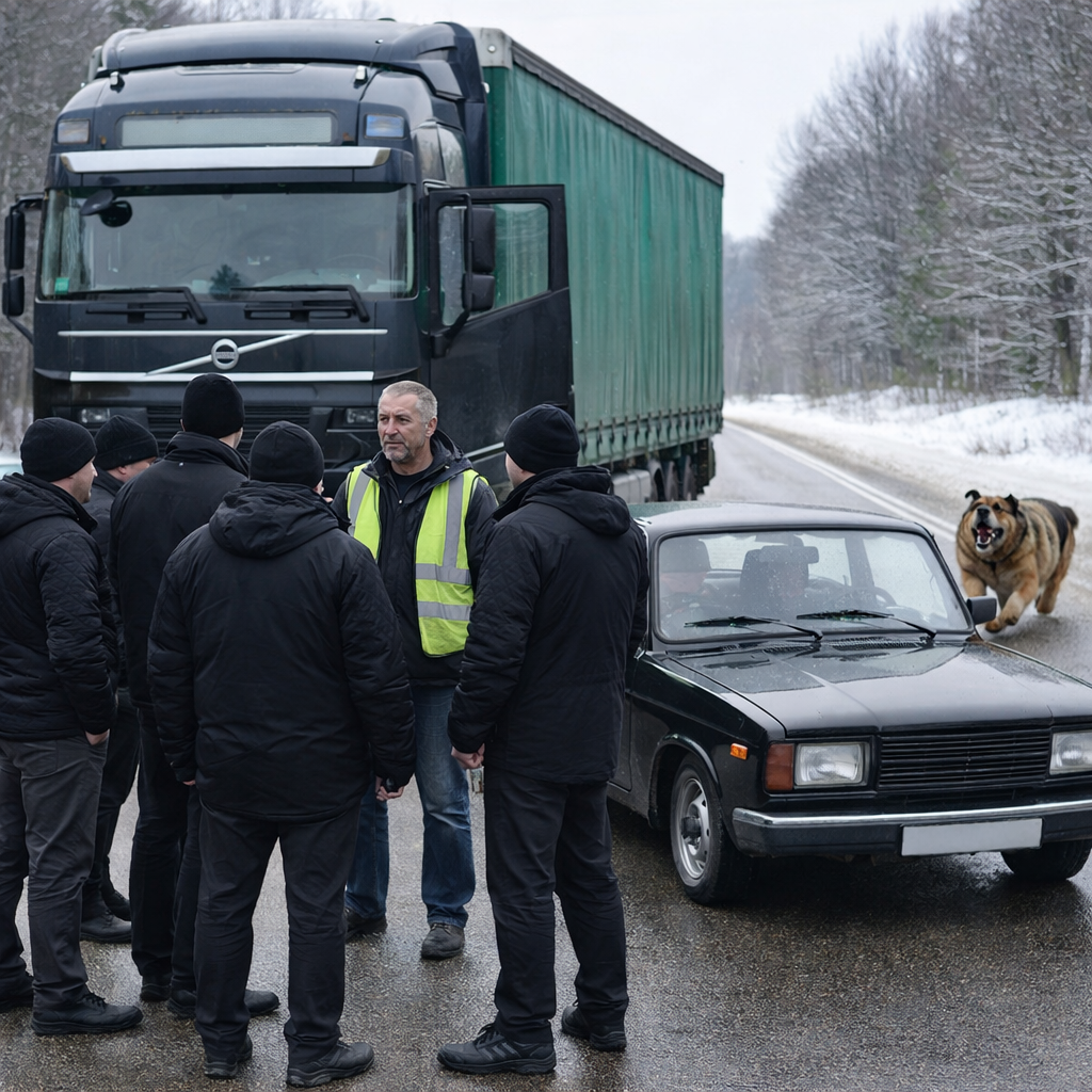 Степаныч резко затормозил, выскочил из кабины с монтировкой. Из джипа, шатаясь, вываливались трое — окровавленные, кричащие. Буран стоял перед ними, рыча, не подпуская к фуре.