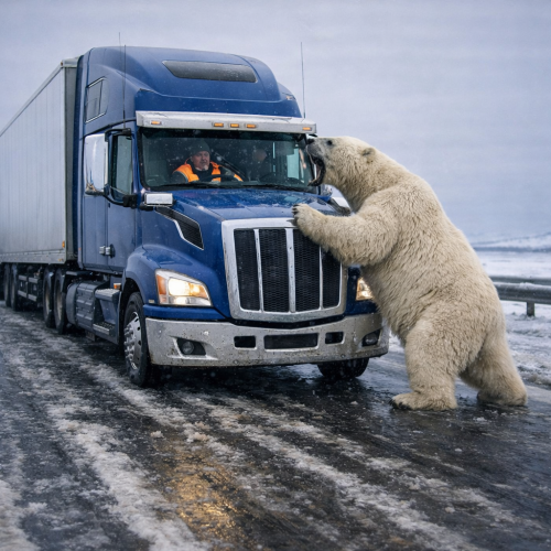 Впереди, примерно в сотне метров, возник тёмный силуэт. Сначала Николай решил, что это валун или кусок обледенелой скалы. Однако пятно шевельнулось, и он понял — медведь. Белая медведица. Крупная, с желтоватым оттенком шерсти, она стояла прямо посреди зимника и смотрела на приближающийся грузовик.