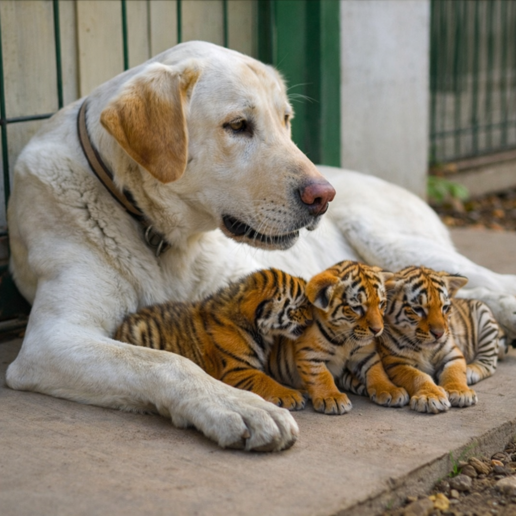 Собака осторожно подошла к тигрятам, лизнула одного из них, и тот сразу притих, прижимаясь к её боку.