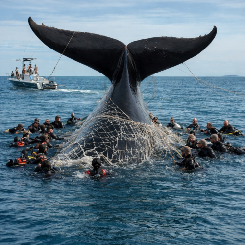 Когда ныряльщики опустились под воду, перед ними открылась пугающая картина. Огромное животное тащило за собой громадную тяжесть — рыболовную сеть, весившую почти тонну. На теле кита виднелись глубокие порезы, свидетельствующие о том, что этот морской гигант уже несколько дней отчаянно боролся за свою жизнь, постепенно теряя силы.