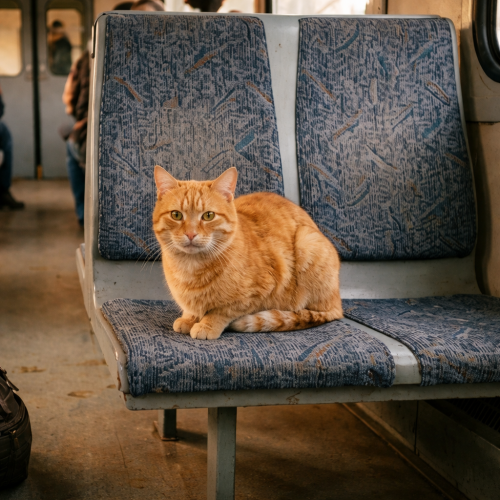 За окном мелькали огни станций, чередовались тёмные участки леса. Иногда кот поворачивал голову к стеклу, следя за движением света — спокойно, без суеты, с той самой ленивой внимательностью, которая свойственна кошкам. Потом снова смотрел вперёд или прикрывал глаза на несколько секунд.
