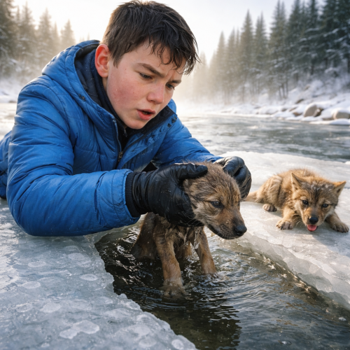 Денис провалился в ледяную воду почти по пояс. Холод пронзил тело так, что дыхание сперло. Он изо всех сил удерживал щенков над водой, боролся, пытался зацепиться за край льда, но лёд трескал и ломался под ним.
