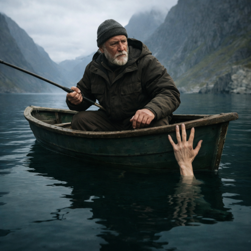 Иван не раздумывал. Он бросил удочки, навалился на весла и рванул лодку поперёк течения. Сердце колотилось, руки дрожали, но он грёб, не чувствуя усталости. На середине реки вода была ледяной, ветер дул в лицо, но Иван видел лишь тонущую машину. Она почти скрылась под водой — торчала только крыша. Вдруг с водительской стороны открылась дверь, из воды показалась голова, руки, кто-то барахтался, пытаясь выбраться.
