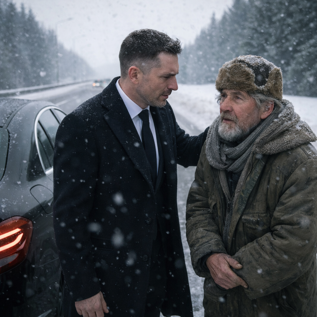 Сергей притормозил и вышел из машины. Перед ним оказался старик — худощавый, в лёгкой куртке, явно не по погоде, и в каких-то нелепых ботинках, обмотанных скотчем. На голове не было шапки, седые волосы растрепались, лицо было обветренным, но чистым, без следов пьянства. Старик не спал — он просто смотрел перед собой пустым взглядом, будто не чувствовал ни холода, ни происходящего вокруг.