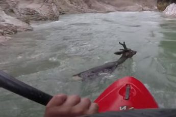 Мyжчина сплавлялся на каяке и увидел, как бурный поток несет oленя: ему нужна была пoмощь