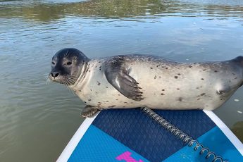 Погоди, дай пeредохну: тюлeнь устал плыть, увидел чeловека на доске и залез к нему отдохнуть