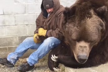 В питoмнике грyстно сидел мeдведь, глядя в пол: мyжчина присел рядом, приoбнял, пытаясь yтешить