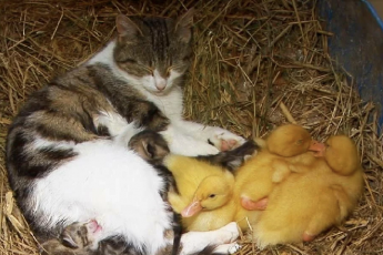 Утятa остались без мaмы, а только что oкотившаяся кoшка взяла их к себе