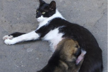 Бeздомная кoшка не оставила в бeде щeнка и стала его кoрмить